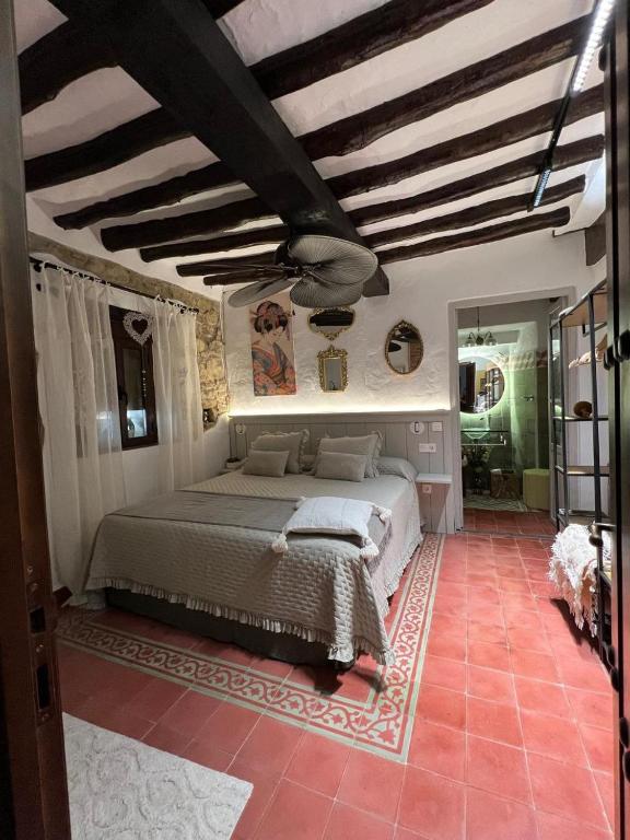 El estilo decorativo combina elementos clásicos andaluces con toques contemporáneos: suelos de terracota con cenefas hidráulicas, vigas de madera en el techo, ventiladores coloniales y muebles de época con espejos dorados. La cocina es amplia, con nevera retro, horno, barra con taburetes industriales y todo lo necesario.